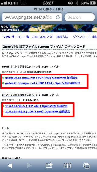 OpenVPN Connect のインストールが完了している場合は、iPhone / iPad の画面上で 公開 VPN 中継サーバー一覧ページ を開き、.ovpn ファイルを直接ダウンロードしてインポートすることができます。